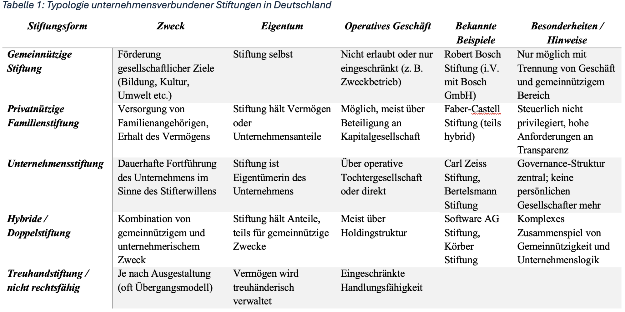 Die folgende Übersicht (Tabelle 1) fasst die zentralen Typen unternehmensverbundener Stiftungen in Deutschland zusammen. Dabei werden Zwecksetzung, Eigentumsstruktur, operative Ausgestaltung sowie bekannte Praxisbeispiele systematisch gegenübergestellt. Die Tabelle dient gleichzeitig als Referenzrahmen für die nachfolgenden Kapitel, in denen insbesondere die praktische Umsetzung, Governance-Mechanismen und strategische Zielbilder vertieft werden.