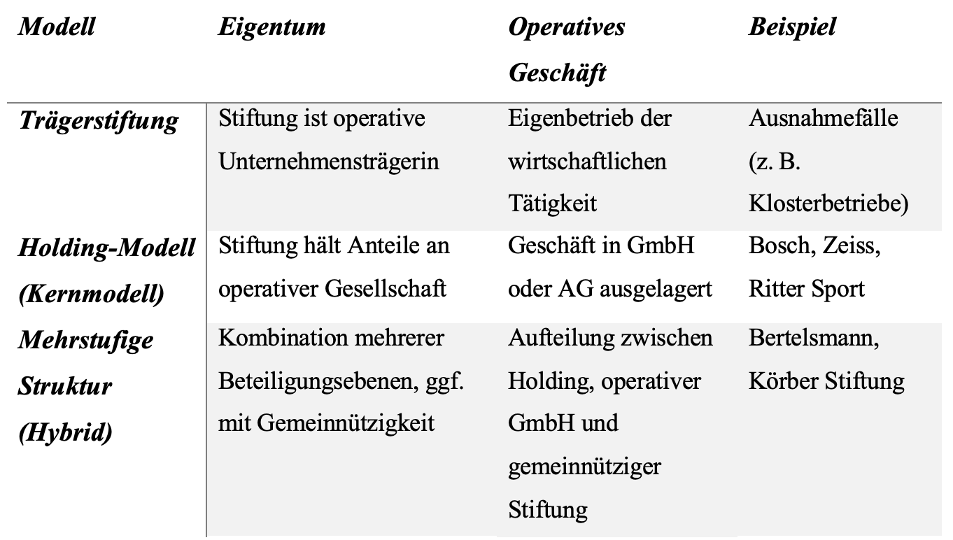 Im internationalen Vergleich zeigen sich drei Hauptmodelle stiftungsgetragener Unternehmensführung (Thomsen, 2016; Kaufmann, 2021):
