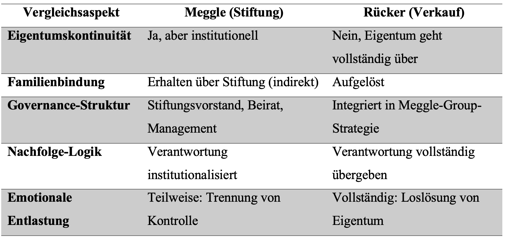 Die Kombination beider Modelle, Rücker als Übergabeobjekt, Meggle als stiftungsgeführter Käufer, ist im deutschen Mittelstand bislang selten öffentlich reflektiert worden, bietet aber enormen Erkenntnisgewinn: Stiftung und Verkauf sind keine Gegensätze, sondern unterschiedliche Formen, wie Familienunternehmen mit Verantwortung umgehen.