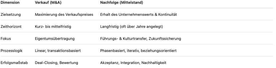 Die Übergabe eines Unternehmens ist kein Exit, sie ist ein strukturierter Übergang. Wer Nachfolge professionell denkt, erkennt: Der Unterschied zum Verkauf liegt nicht nur in der Perspektive, sondern in der gesamten Prozesslogik.